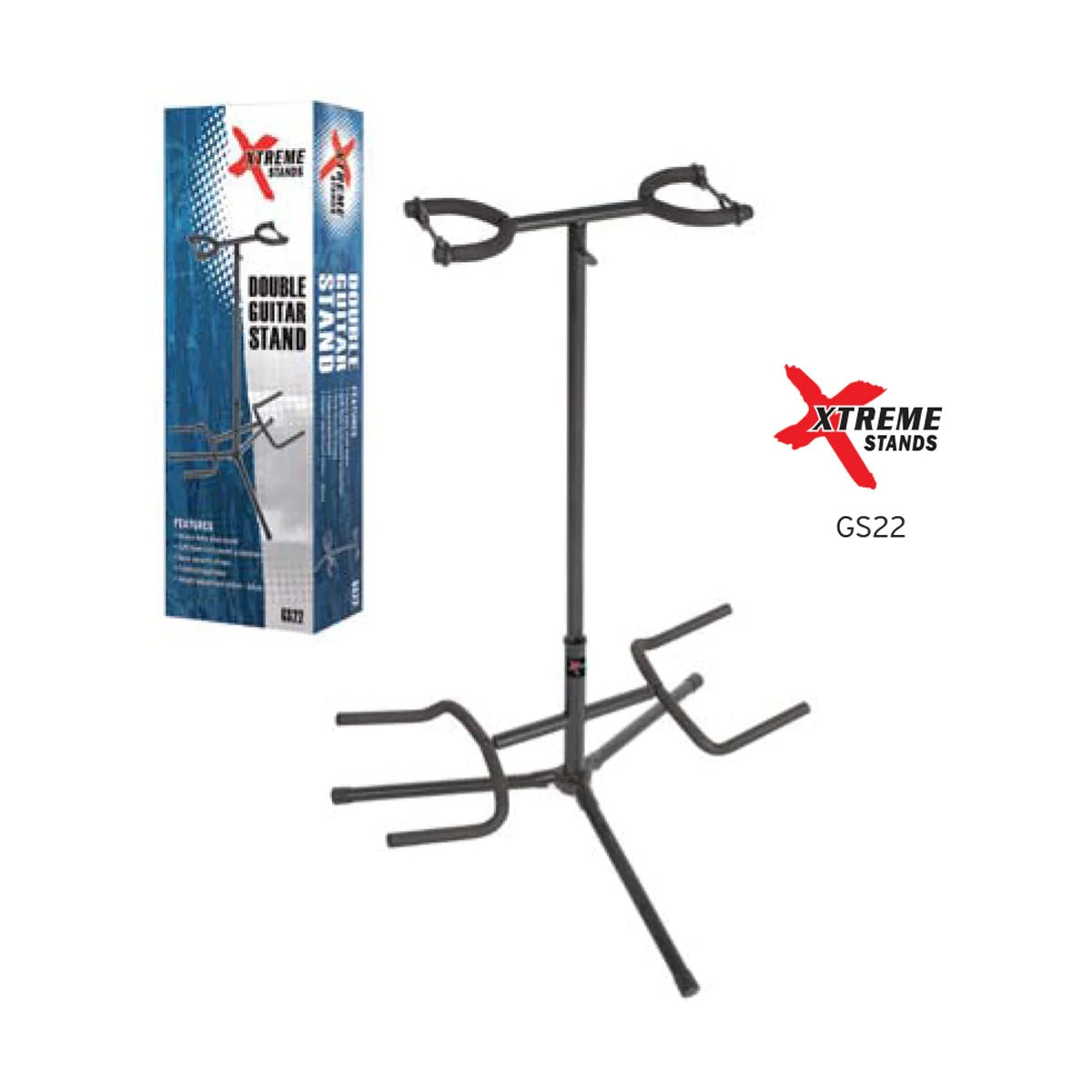 Heavy Duty Double guitar stand for holding 2 guitars. EVA foam rubber protection for neck and body. Neck safety lock. Painted gloss display box. Black.